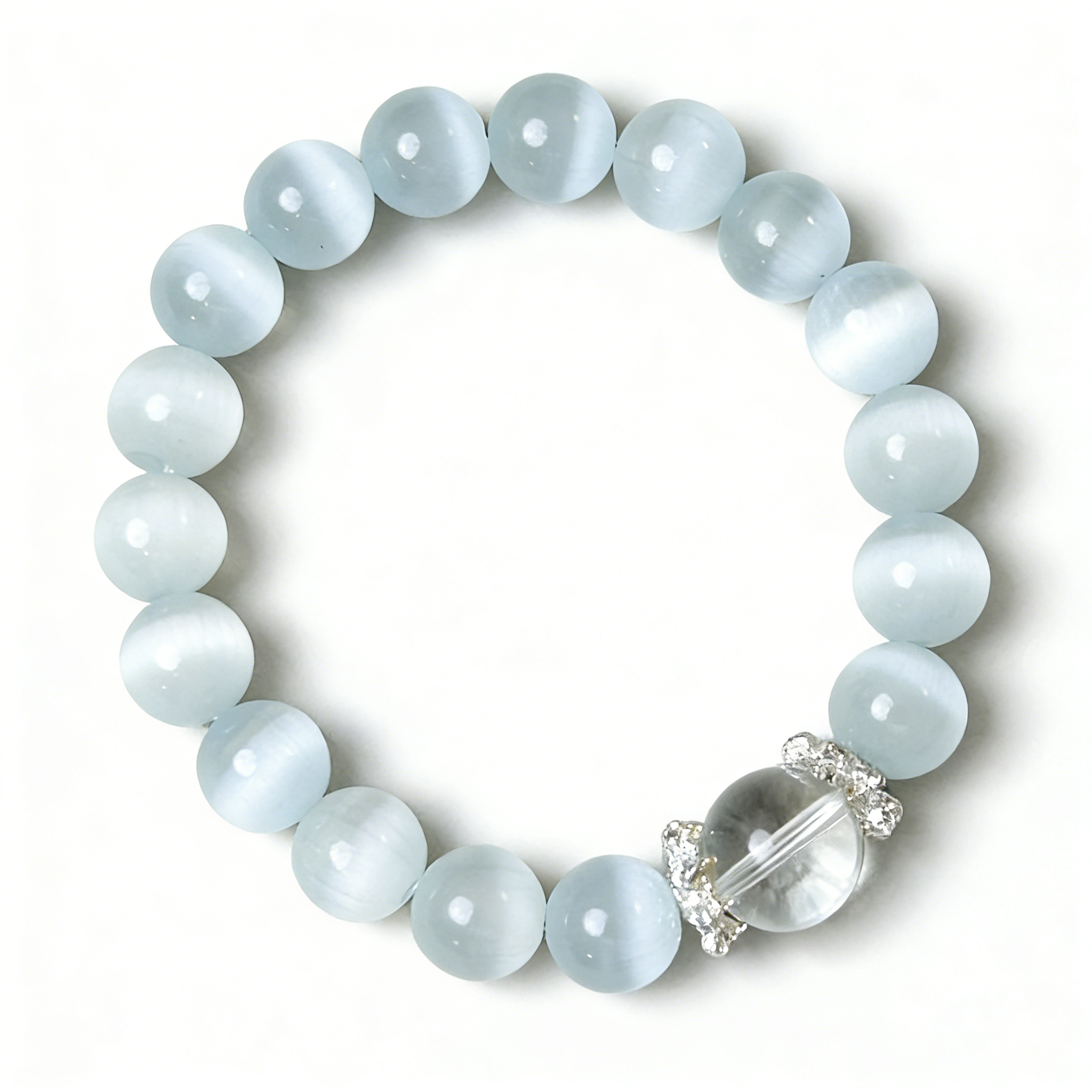 This bracelet is a must-have all-match staple that adds exquisite touch to every daily outfit of yours!With a slim 10mm bead size, it fits snugly on your wrist without bulkiness, super lightweight for typing, carrying bags or holding drinks. The natural white cat’s eye features a delicate soft glow, shimmering with vivid cat-eye luster as you move your wrist — subtle, not flashy, exuding a calm and gentle temperament. Paired with transparent clear quartz beads, it creates a clean and premium overall tone, finished with silver-plated K gold diamond-embedded spacers for a hint of understated sparkle, low-key yet elegant.